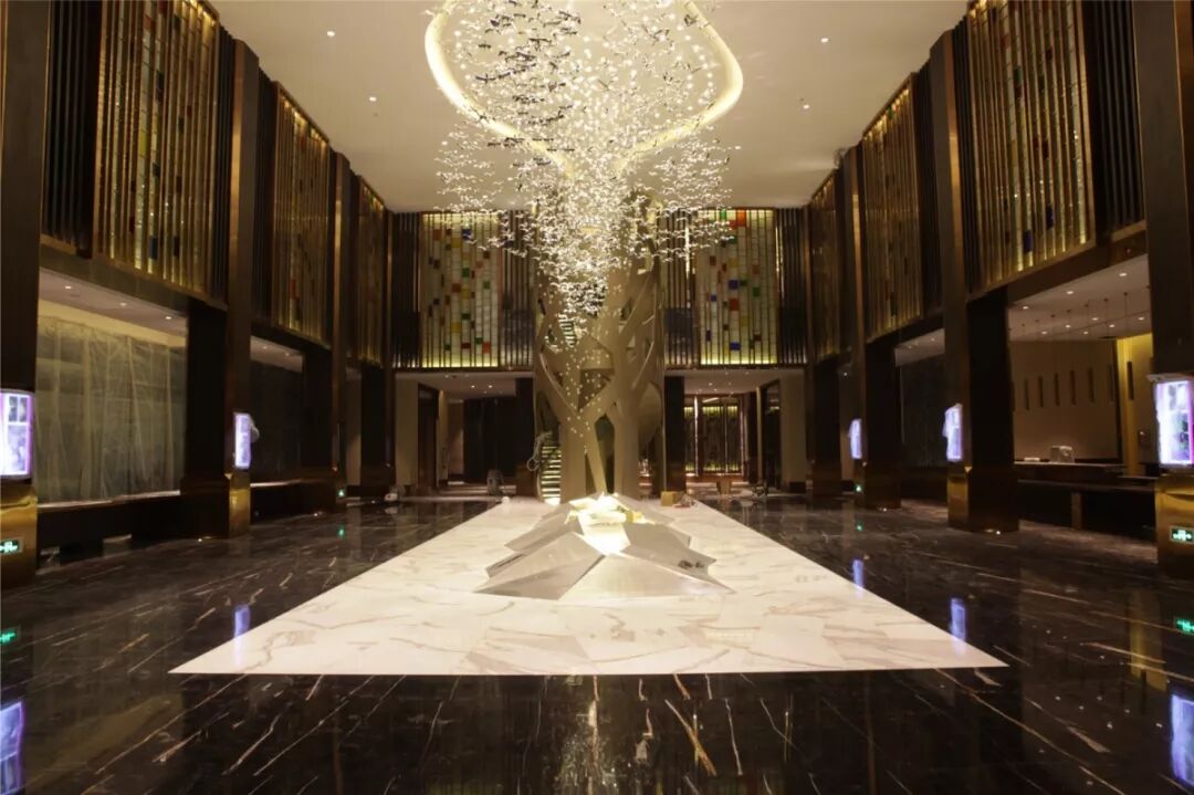 酒店大堂百鳥(niǎo)歸巢的裝飾聳立其中,更加讓人眼前一亮!
